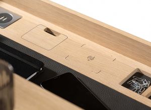 Grâce à ses nombreuses fonctions supplémentaires, le secrétaire filigno est un bureau à domicile parfaitement équipé. Les ports USB et la prise dont il dispose permettent au secrétaire filigno d'assurer l’alimentation en énergie de divers appareils.  La station de charge sans fil disponible en option permet en outre la recharge de smartphones.  Et pour les appareils nécessitant un raccordement câblé, la sortie de câble intégrée permet de dissimuler facilement les câbles à l’intérieur du secrétaire, et ce de façon élégante. Vos stylos trouveront leur place dans l’espace de rangement pratique, de même que vos petits trésors dans le compartiment secret caché en dessous.