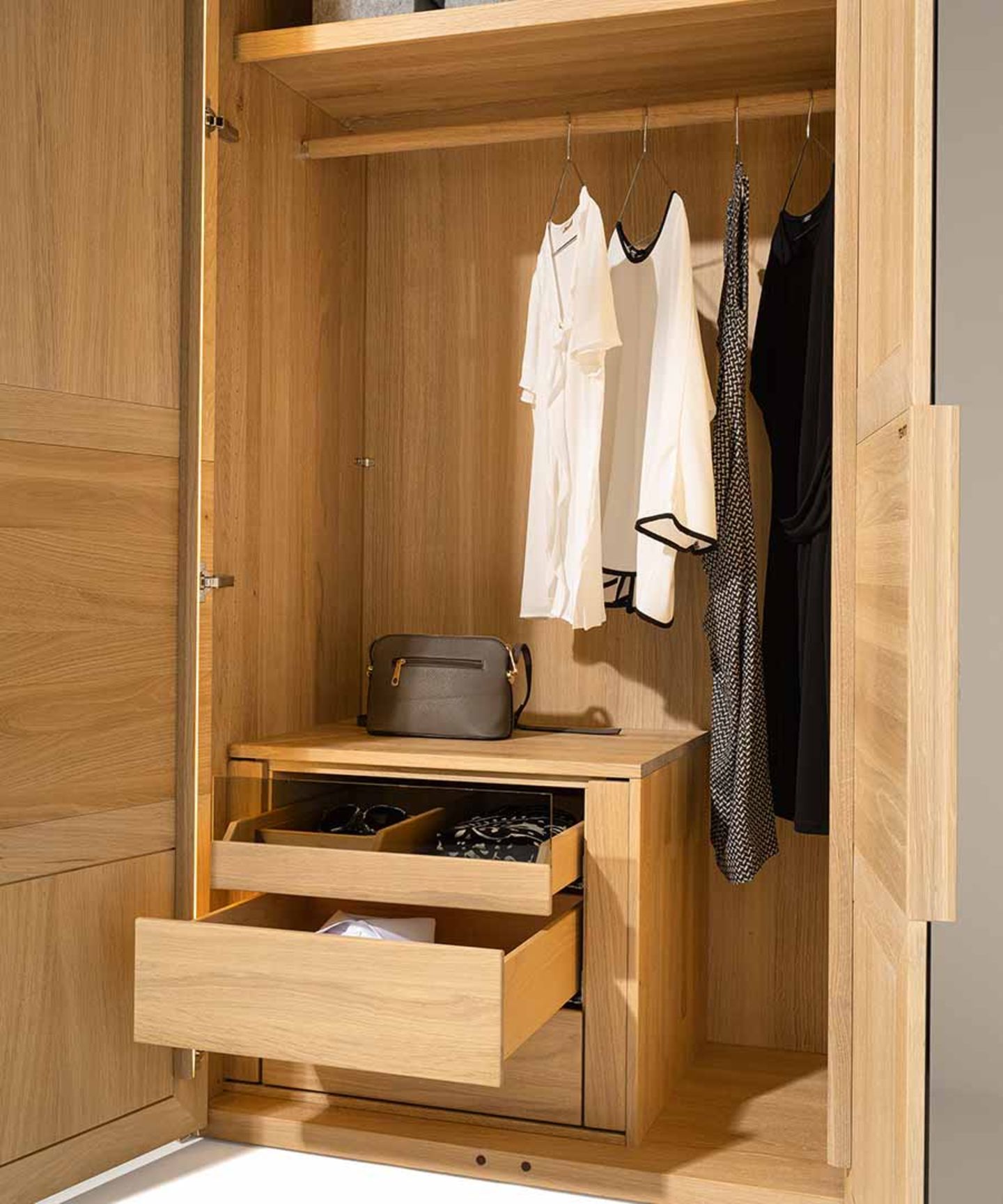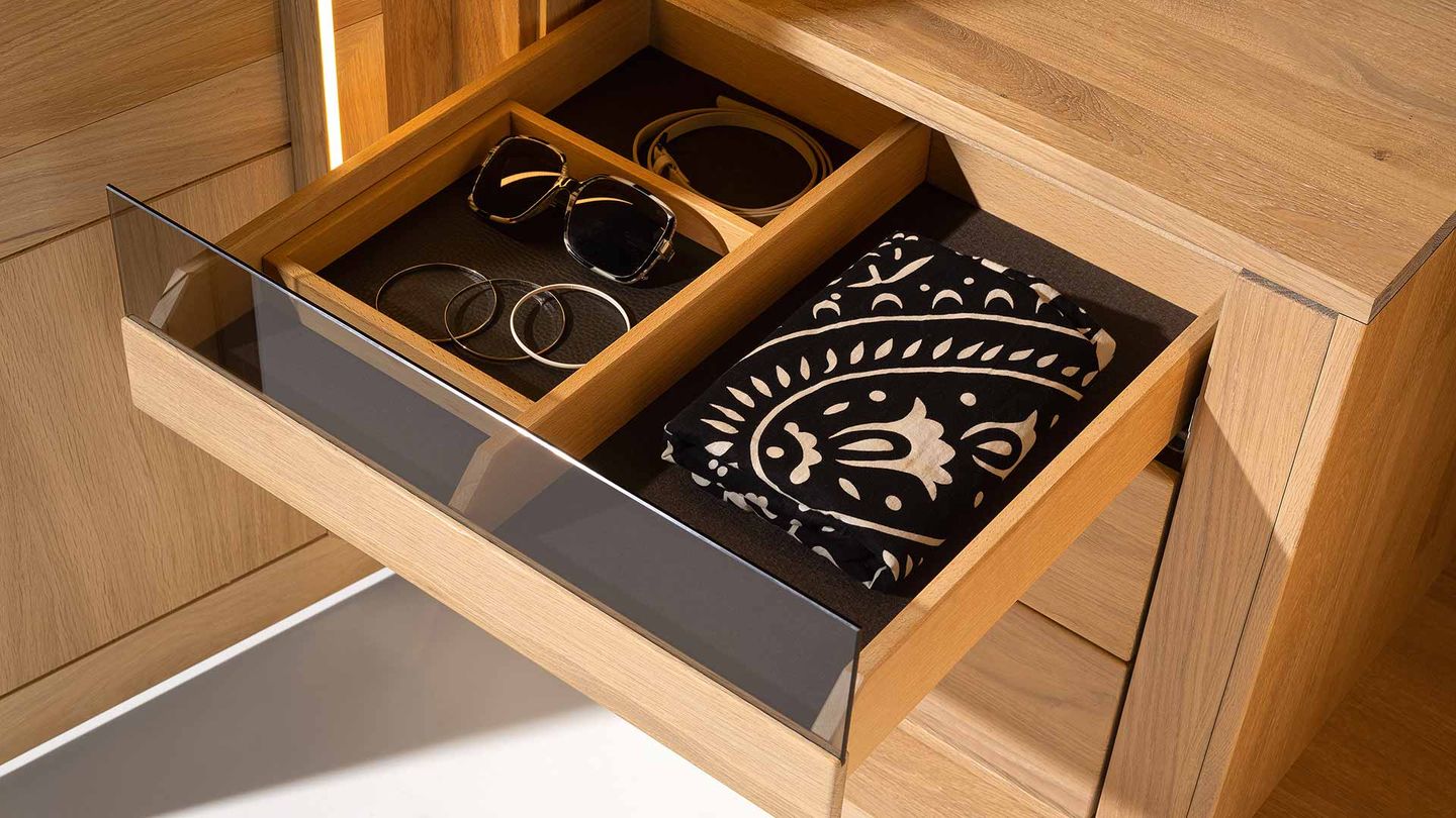 Gli accessori interni, funzionali e diversificati, assicurano comfort e una chiara visione d'insieme. Ausili pratici, come appendiabiti inclinabili, portacamicie estraibili e cassetti interni con divisori aiutano a trovare con rapidità e stile gli abbinamenti perfetti. È possibile dotare l’armadio di illuminazione a LED a basso consumo per mettere sotto la giusta luce gli accurati dettagli funzionali.