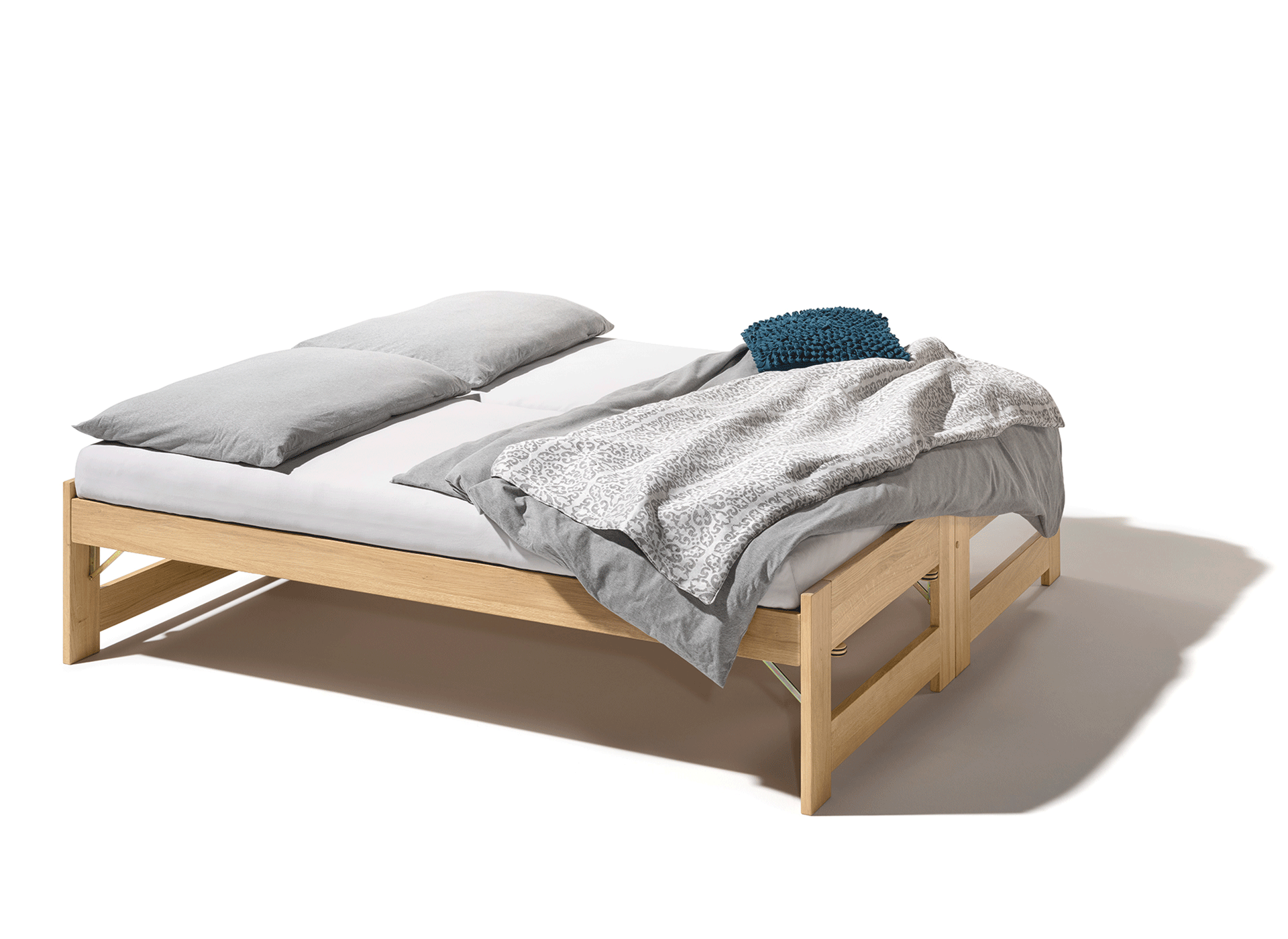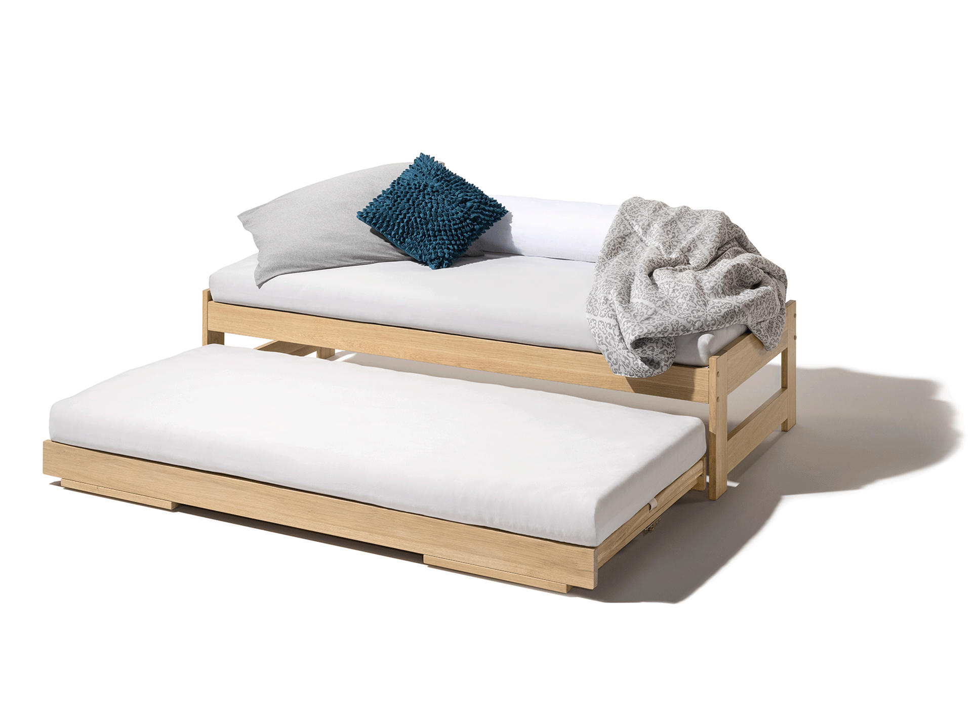 Quelques gestes suffisent pour transformer le lit gigogne cubus en lit double ou vice-versa, qui convient parfaitement à la chambre d’enfants ou d’amis. Il offre le maximum de confort aux invités et, le cas échéant, une surface de couchage généreuse. Le deuxième lit disparaît sous le premier sans prendre de place. Le lit gigogne cubus est disponible en aulne, hêtre, cœur de hêtre, chêne et chêne blanc, offrant ainsi une multitude d’aménagements et de combinaisons avec les corps et armoires modulaires TEAM 7.