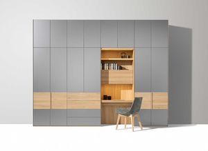 L’elemento saliente dell’armadio ad ante battenti valore è una fascia compresa tra due fughe, realizzabile in legno naturale con venatura orizzontale oppure in vetro colorato. In contrasto con questa fascia, le ante battenti possono essere realizzate in legno con venatura verticale oppure in vetro colorato. La fascia nella variante relief risulta particolarmente vivace ed elegante con le sue fresature che si sviluppano perpendicolari alla venatura.