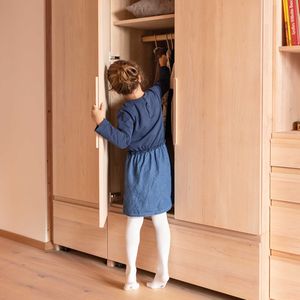Unser kids Kinderkleiderschrank wird massiv aus echtem Naturholz gefertigt und wie alle unsere stabilen Massivholzmöbel im eigenen Prüflabor umfassend getestet. Sanft abgerundete Ecken und Kanten reduzieren die Verletzungsgefahr beim Spielen und der gedämpfte Schließmechanismus der Drehtüren hilft, das Einklemmen von Fingern zu vermeiden. Um kein Umkippen zu ermöglichen, werden unsere Kinderzimmerschränke und Regale an der Wand montiert. Ausschließlich mit Naturöl veredelt und formaldehydfrei verleimt ist das Holz für unsere Kleiderschränke schadstofffrei und bestens für das Kinderzimmer geeignet.