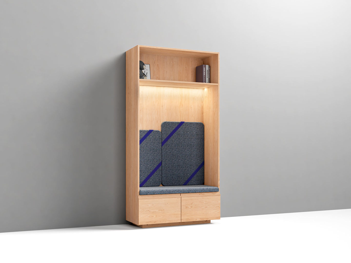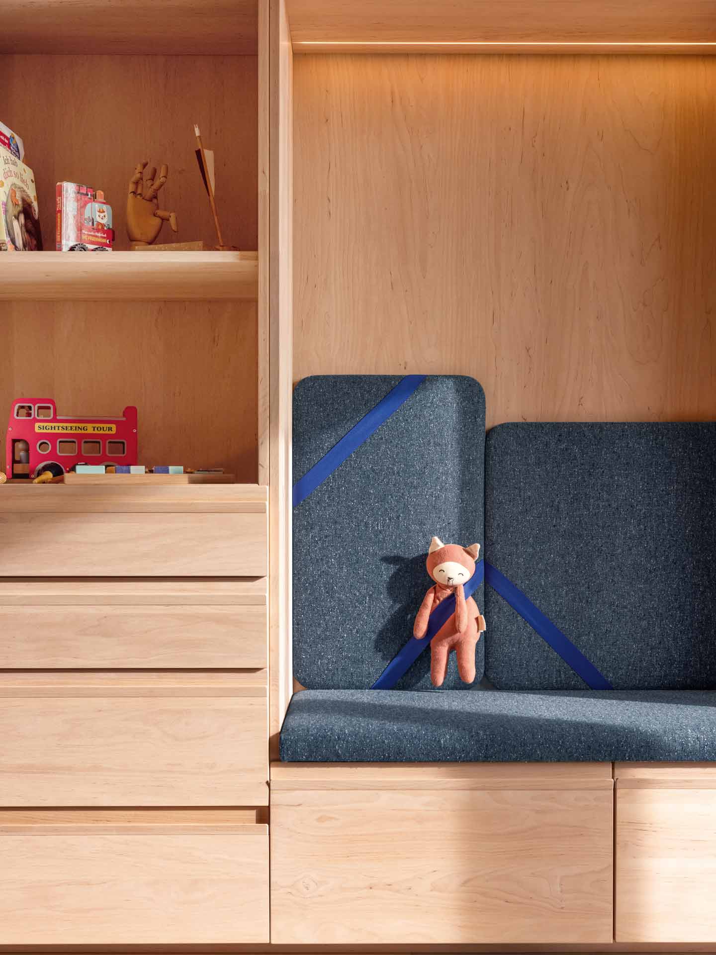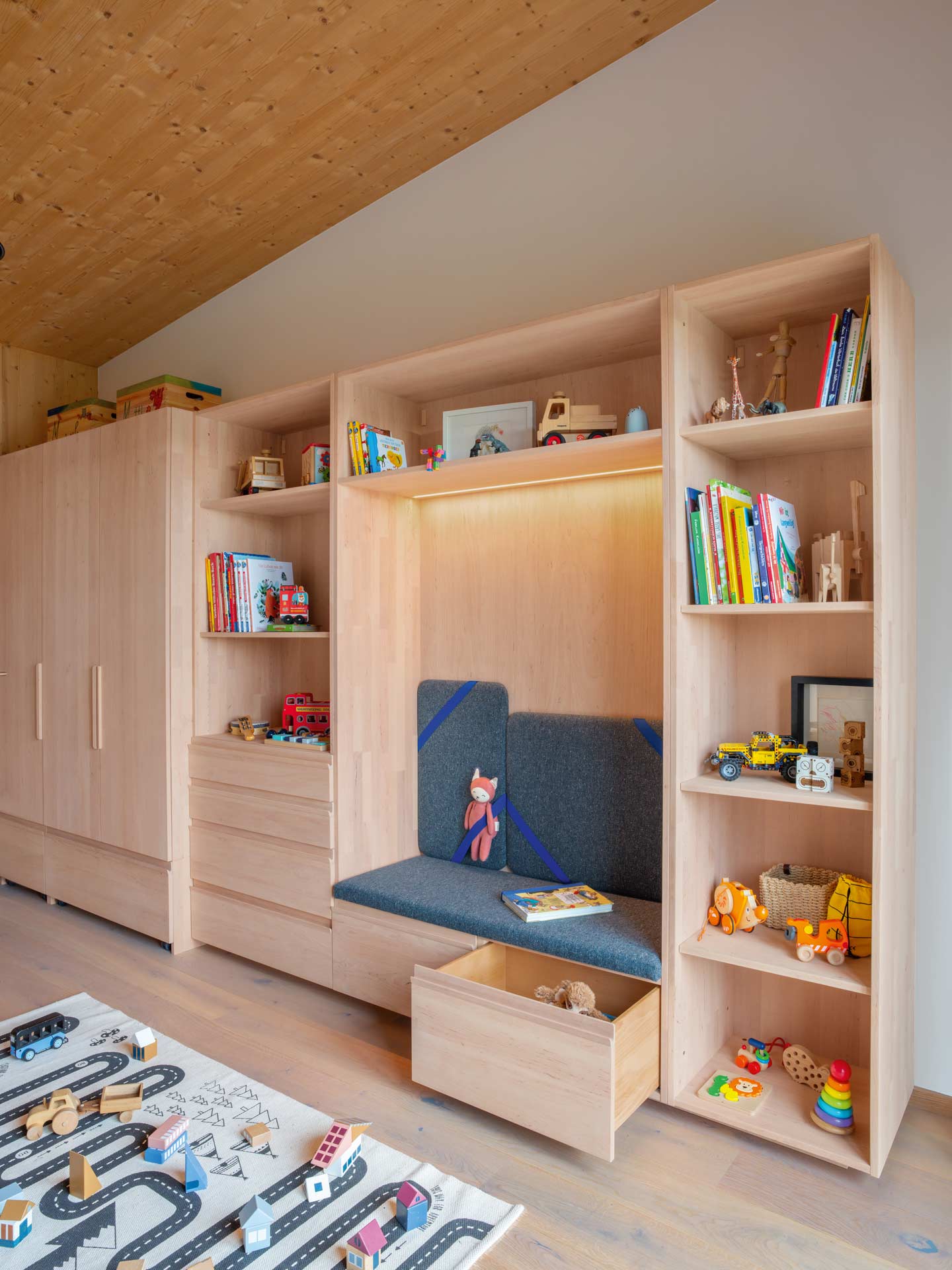 Die gepolsterte Sitznische ist der perfekte Rückzugsort im Kinderzimmer zum Lesen, Chatten oder Rasten. Umgeben von reinem Naturholz strahlt dieser Ort eine besondere Wärme und Geborgenheit aus. Praktische Gummibänder in den Farben wasserblau, waldgrün und feuerrot halten Bücher, Kuscheltiere, Kopfhörer und anderes griffbereit. Die LED-Beleuchtung erzeugt dabei eine angenehme Lichtstimmung.