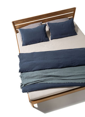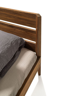Своим «воздушным» характером кровать light обязана утончённой конструкции и сужающимся ножкам, за счёт чего кровать кажется ещё более изящной. По бокам ножки выполнены с продолжающейся текстурой и открывают взгляду красивый торец массивной древесины. Ножки имеют слегка скошенную форму и ловким образом привлекают внимание к интересному элементу дизайна – угловому соединению.