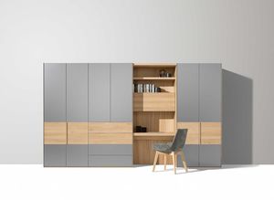 Charakteristisch für den lunetto Drehtürenschrank sind seine quer über eine Schrankzelle verlaufende, waagrechte Holzmaserung und eine Teilungsfuge. Die Kombinationsmöglichkeit mit Farbglasfronten erlaubt einen modernen Materialmix . Eine elegante Winkelgriffleiste aus Naturholz oder die kubische Griffstange in Edelstahl runden das Bild ab.