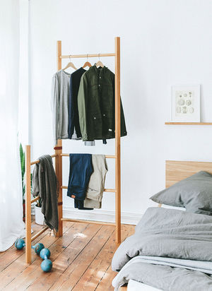 Soll die oberste Sprosse von italic als Kleiderstange genutzt und Bügel mit Kleidungsstücken aufgehängt werden, können die zweite und dritte Sprosse entfernt werden. Durch die raffinierte Schrägstellung der Holme ist die einfach lösbare Verbindung dieser Sprossen auf den ersten Blick nicht sichtbar.